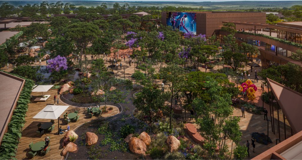 – Torre corporativa integrada à rua com praça, mesas, cadeiras sob um piso mosaico com fonte luminosa.